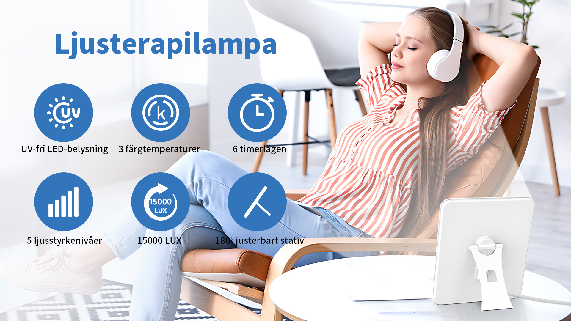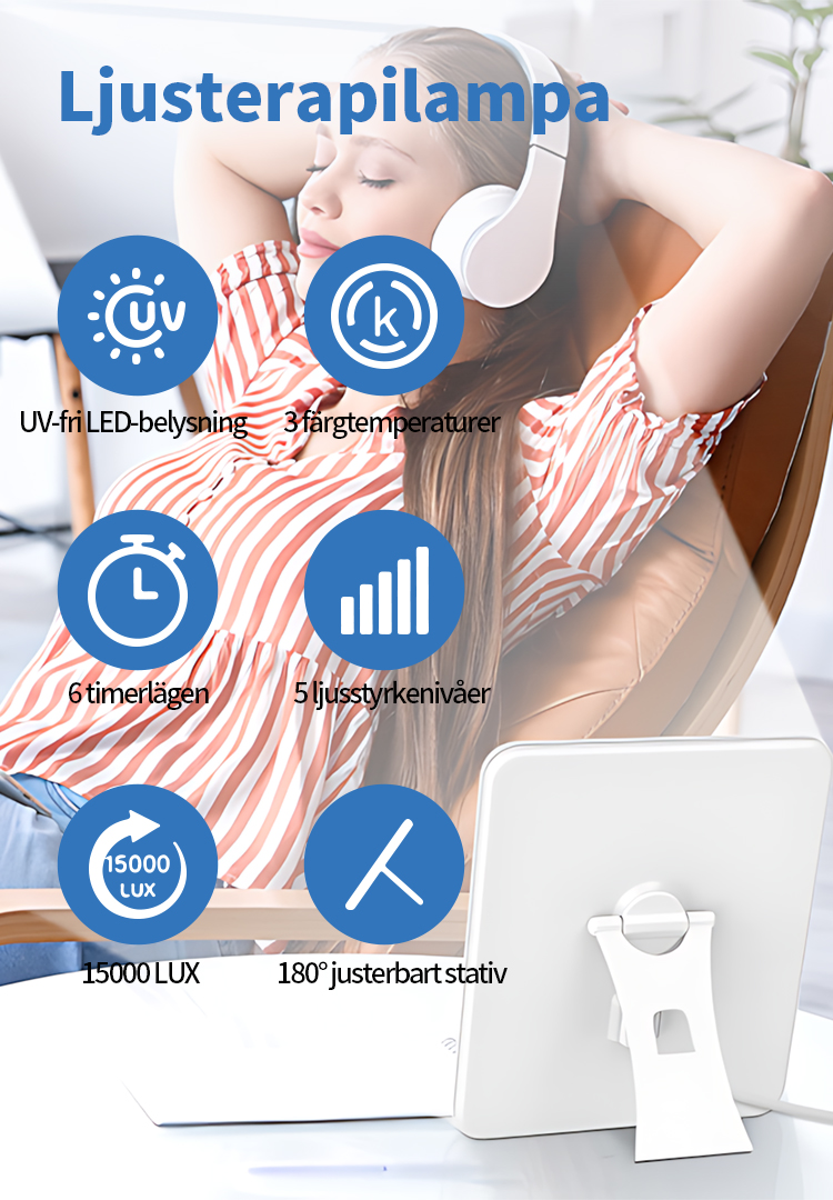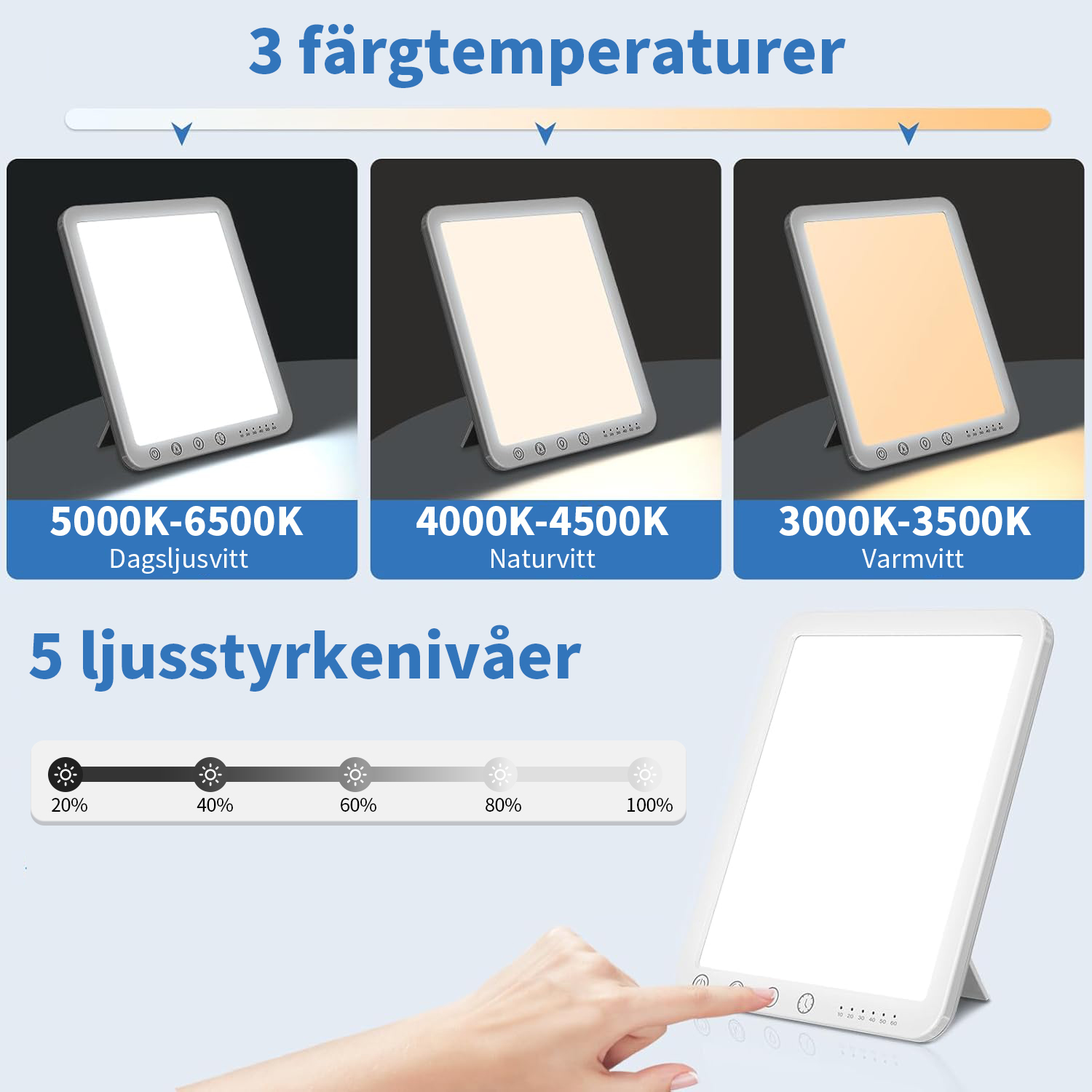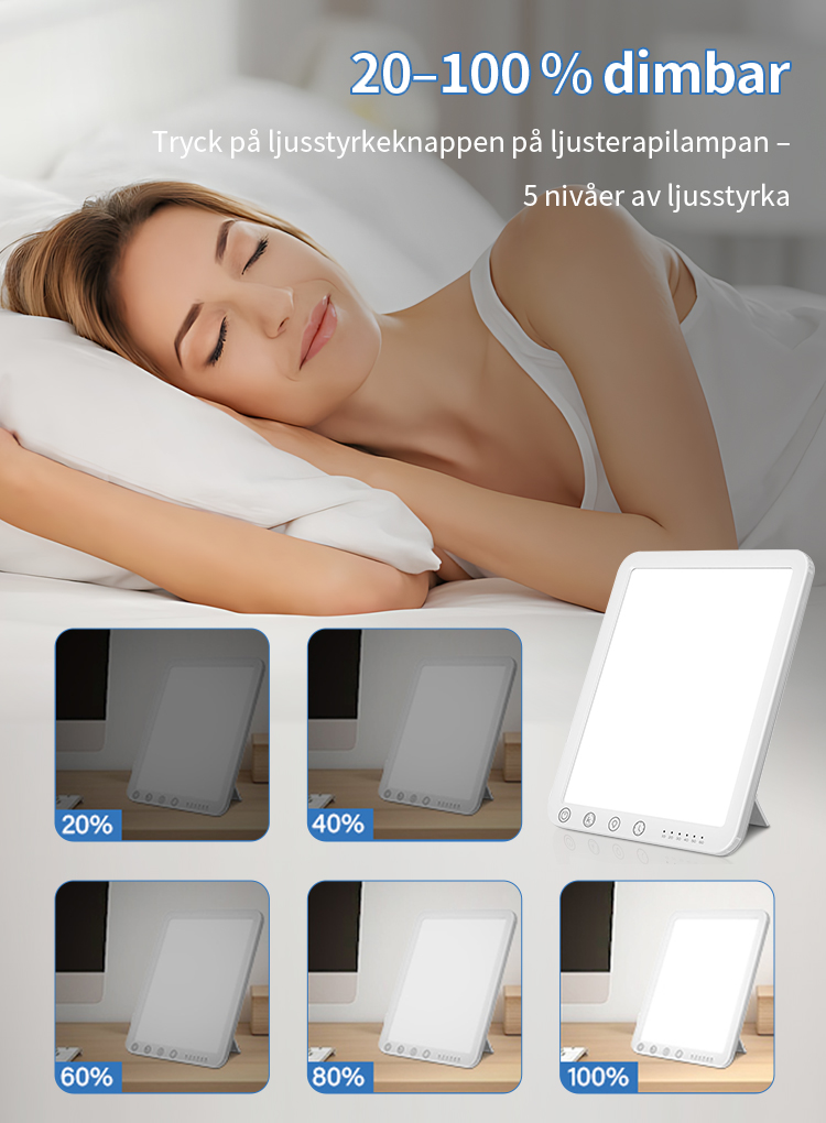 Vår ljusterapilampa erbjuder 5 ljusstyrkenivåer (20–100 %) för maximal komfort och anpassning utan att anstränga ögonen. Lampan är utrustad med ett luftkylt chip som håller temperaturen under 36 °C under användning. Det förlänger lampans livslängd och ökar säkerheten vid användning.