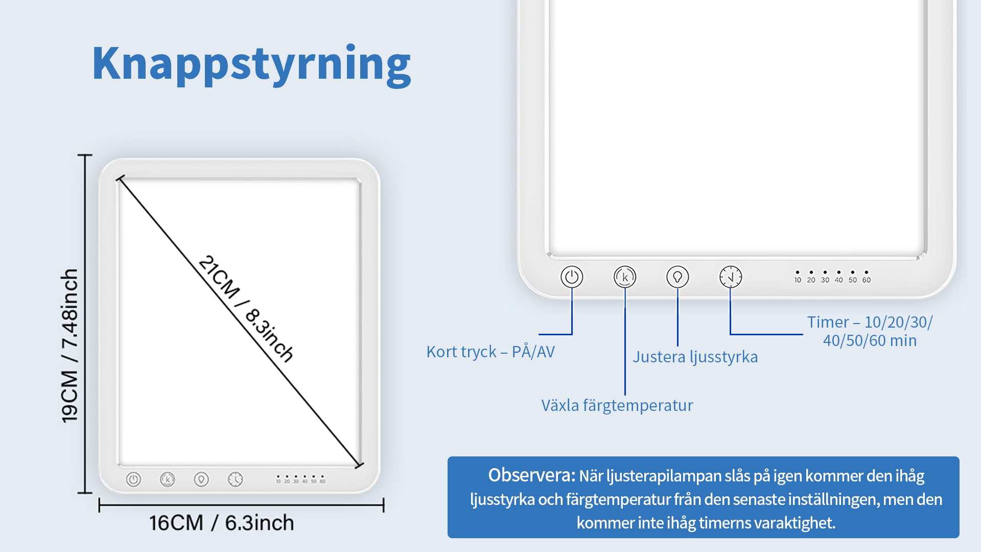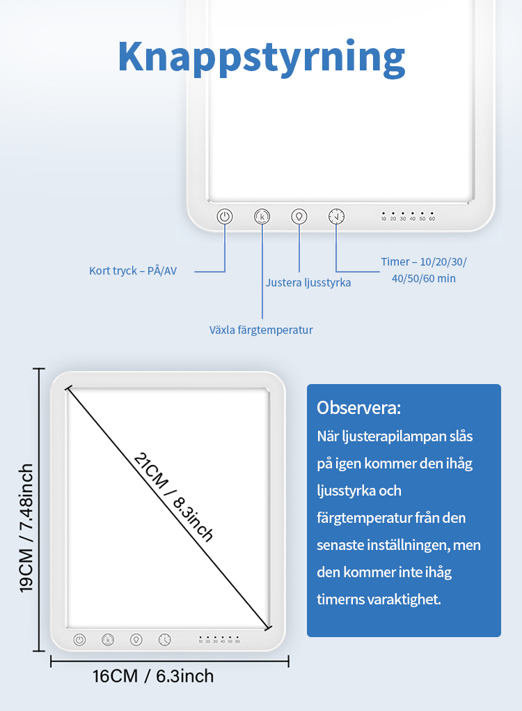 Vår ljusterapilampa erbjuder 3 färgtemperaturlägen: Varmt ljus (3000 K), Naturligt ljus (4000 K) och Kallt ljus (6500 K). Tryck bara på knappen för att växla mellan ljusfärgerna. Oavsett om du vill ha ett varmt, omfamnande ljus för avkoppling eller ett klart, kallt ljus för fokuserat arbete kan du ställa in den mest passande ljusmiljön beroende på avstånd, omgivning och ljuskänslighet.